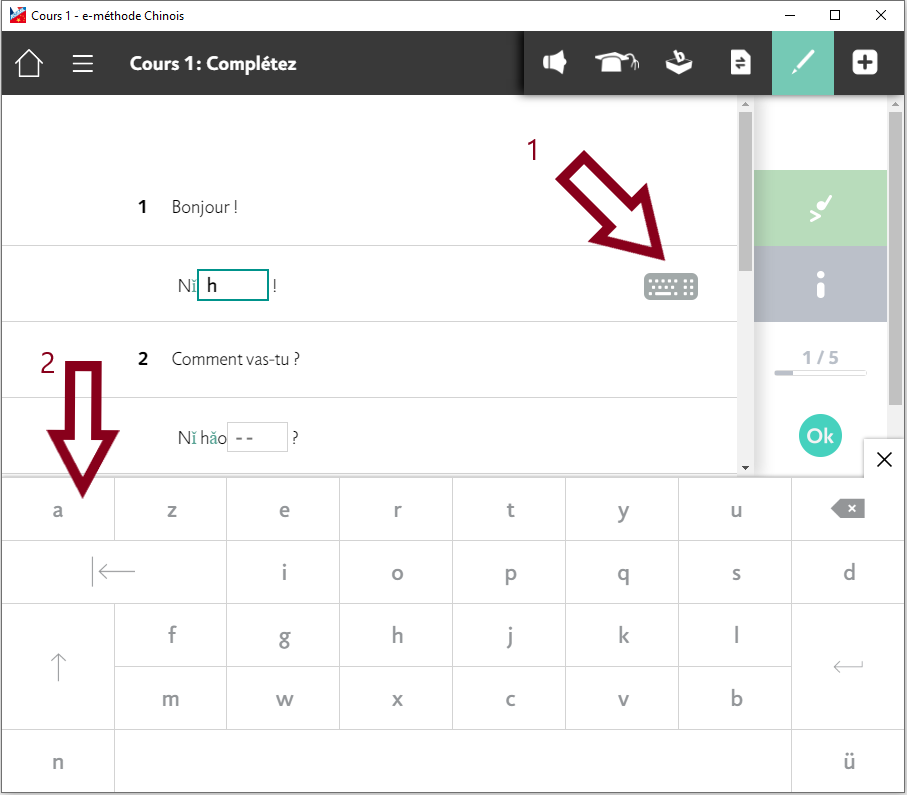 Start by displaying the keyboard by clicking on it, at the end of the line (1).