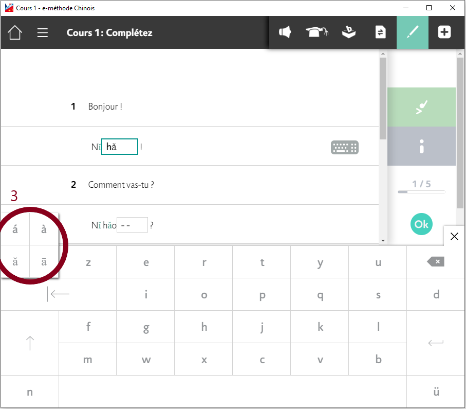 Once the keyboard has been displayed, click and hold down the desired letter (here the "a") (2) to bring down the list of accented characters (3).