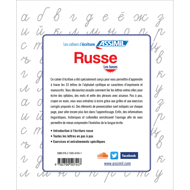 This writing exercise book has been specially designed to help you learn to trace the 33 letters of the Cyrillic alphabet in print and cursive writing. You then find out how to link the letters up to write syllables, words and lastly sentences with ease. Step by step, pen in hand, you can practise writing using the grids and exercises with answers available here. Pronunciation indicators are given on each page, to help you progress even further. Lastly, information about the language, history and culture provide a richer understanding of how the written language evolved.