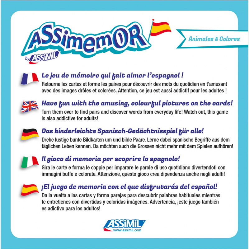 Da la vuelta a las cartas y forma parejas para descubrir palabras de uso corriente divirtiéndote con imágenes graciosas y coloridas. Con Animales y Colores, podemos formar enunciados cortos para describir el color o la textura de un pájaro, de un ratón o de un gato. Atención, ¡este juego también es adictivo para los adultos!