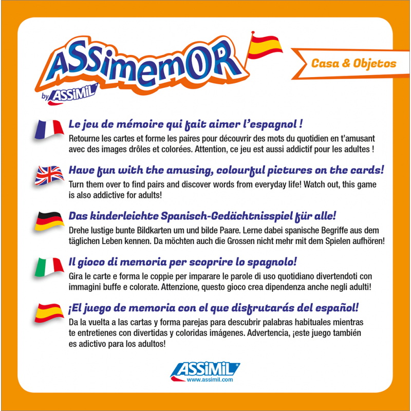 Da la vuelta a las cartas y forma parejas para descubrir palabras de uso corriente divirtiéndote con imágenes graciosas y coloridas. Con Casa y Objetos, aprendemos a reconocer objetos familiares de la vida diaria y a nombrar estancias de la casa. Atención, ¡este juego también es adictivo para los adultos!