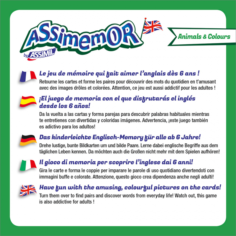 Da la vuelta a las cartas y forma parejas para descubrir palabras de uso corriente divirtiéndote con imágenes graciosas y coloridas. Con Animals and Colors, podemos formar enunciados cortos para describir el color o la textura de un pájaro, de un ratón o de un gato. Atención, ¡este juego también es adictivo para los adultos!