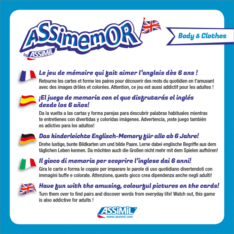 Da la vuelta a las cartas y forma parejas para descubrir palabras de uso corriente divirtiéndote con imágenes graciosas y coloridas. Con Body and Clothes aprendemos fácilmente a reconocer y a nombrar partes del cuerpo y ropa. Atención, ¡este juego también es adictivo para los adultos!