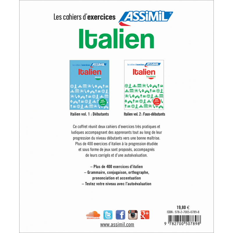 Este pack consta de dos cuadernos de ejercicios muy prácticos y lúdicos que acompañan a los alumnos durante toda su evolución de un nivel de principiante a uno medio. Más de 400 ejercicios de italiano con una progresión estudiada y en forma de juegos, acompañados de sus soluciones y de una autoevaluación.
