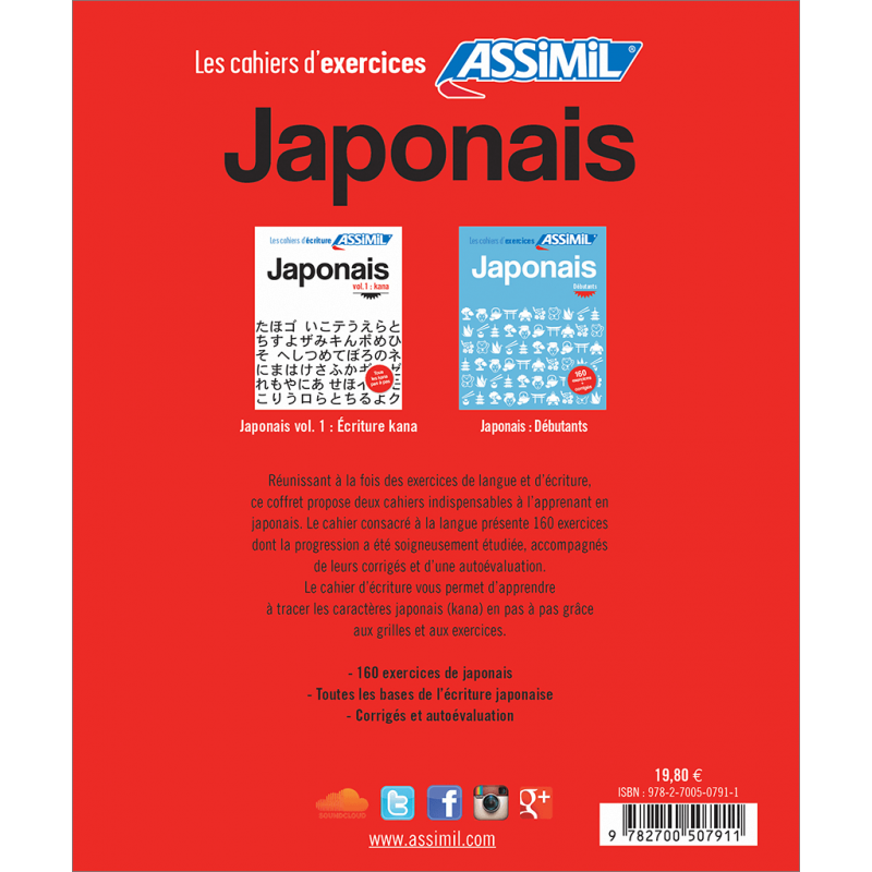 Este pack, que consta de ejercicios de lengua y de escritura, ofrece dos cuadernos indispensables para el estudiante de japonés. El cuaderno dedicado a la lengua presenta 160 ejercicios, cuya progresión se ha estudiado cuidadosamente, acompañados de sus soluciones y de una autoevaluación. El cuaderno de escritura te permite aprender a dibujar los caracteres japoneses (kana) paso a paso gracias a las cuadrículas y a los ejercicios.