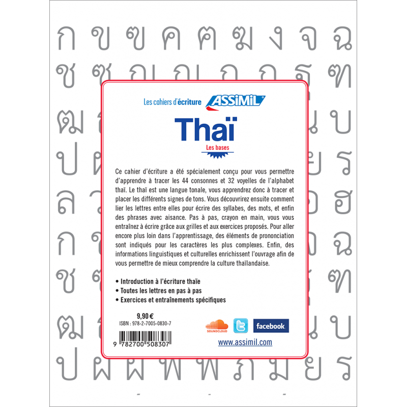 Este cuaderno de escritura ha sido especialmente diseñado para que aprendas a dibujar las 44 consonantes y 32 vocales del alfabeto tailandés. El tailandés es una lengua tonal, por lo que aprenderás as dibujar y a colocar los diferentes signos de tonos. A continuación, descubrirás cómo unir las letras entre sí para escribir sílabas, palabras y frases fácilmente. Paso a paso, lápiz en mano, practicarás la escritura gracias a las cuadrículas y los ejercicios propuestos. Para ahondar más en el aprendizaje, se indican elementos de pronunciación para los caracteres más complejos. Por último, el método se complementa con información lingüística para que puedas comprender mejor la cultura tailandesa.