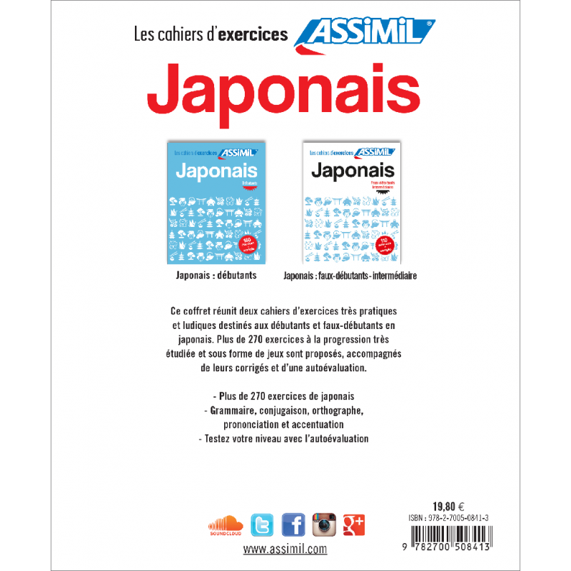 Esta pack consta de dos cuadernos de ejercicios muy prácticos y lúdicos que acompañan a los alumnos durante toda su evolución de un nivel de principiante a C1 aproximadamente (marco europeo común de referencia para las lenguas). Más de 270 ejercicios de japonés con una progresión estudiada y en forma de juegos, acompañados de sus soluciones y de una autoevaluación.