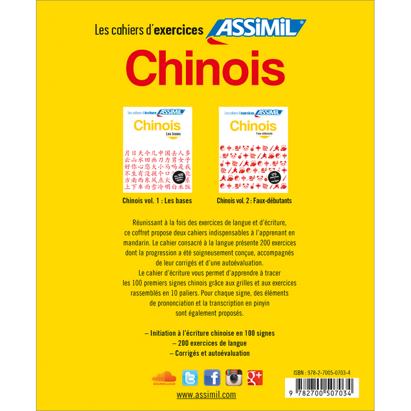 Este pack, que consta de ejercicios de lengua y de escritura, ofrece dos cuadernos indispensables para el estudiante de mandarín. El cuaderno dedicado a la lengua presenta 170 ejercicios, cuya progresión se ha diseñado cuidadosamente, acompañados de sus soluciones y de una autoevaluación. El cuaderno de escritura te permite aprender a dibujar los 100 primeros signos chinos gracias a las cuadrículas y a los ejercicios reunidos en 10 niveles. Por cada signo se proponen la transcripción en pinyin y elementos de pronunciación.