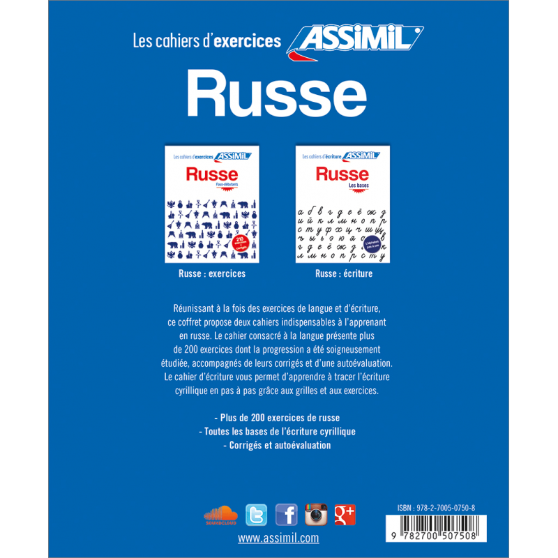 Este pack, que consta de ejercicios de lengua y de escritura, ofrece dos cuadernos indispensables para el estudiante de ruso. El cuaderno dedicado a la lengua presenta más de 200 ejercicios, cuya progresión se ha estudiado cuidadosamente, acompañados de sus soluciones y de una autoevaluación. El cuaderno de escritura te permite aprender a dibujar la escritura cirílica paso a paso gracias a las cuadrículas y a los ejercicios.