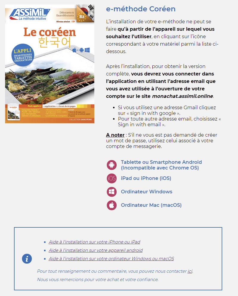 Votre e‑méthode est maintenant enregistrée et ajoutée à vos produits numériques sur la plateforme de téléchargement Assimil.