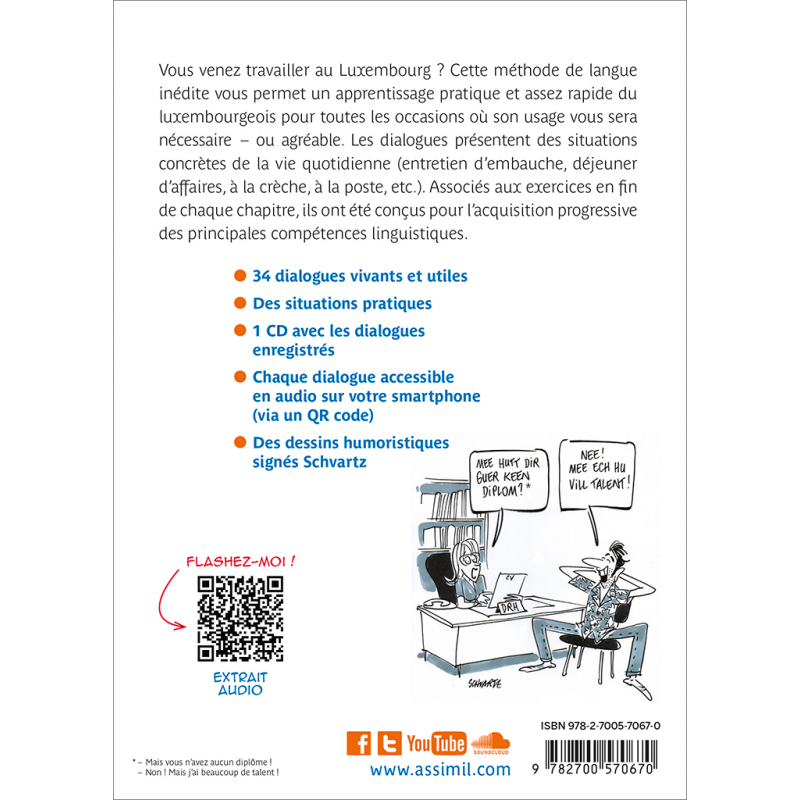 ¿Vas a trabajar o a vivir a Luxemburgo? Este método de lengua inédito te permite un aprendizaje práctico y bastante rápido del luxemburgués para todas las ocasiones en las que su uso te resulte necesario o agradable. Los diálogos presentan situaciones concretas de la vida diaria (entrevista de trabajo, comida de negocios, en la guardería, en Correos, etc.). Asociados a los ejercicios al final de cada capítulo, han sido diseñados para la adquisición progresiva de las principales competencias lingüísticas.