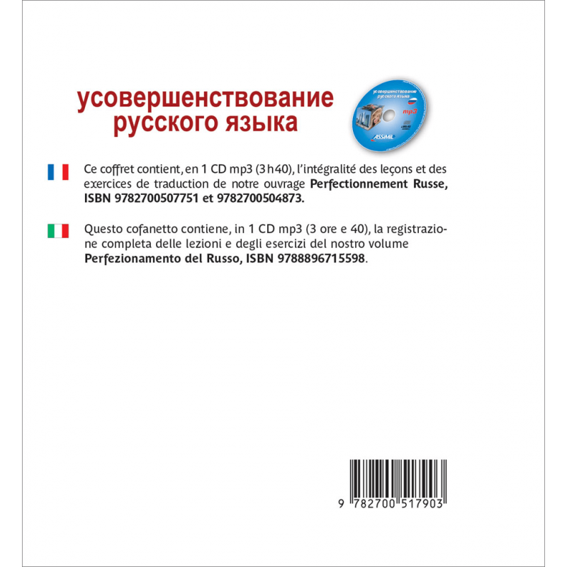 Este pack incluye las grabaciones correspondientes a los libros Perfectionnement russe (ISBN 9782700507751) y Perfezionamento del Russo (ISBN 9788896715598).