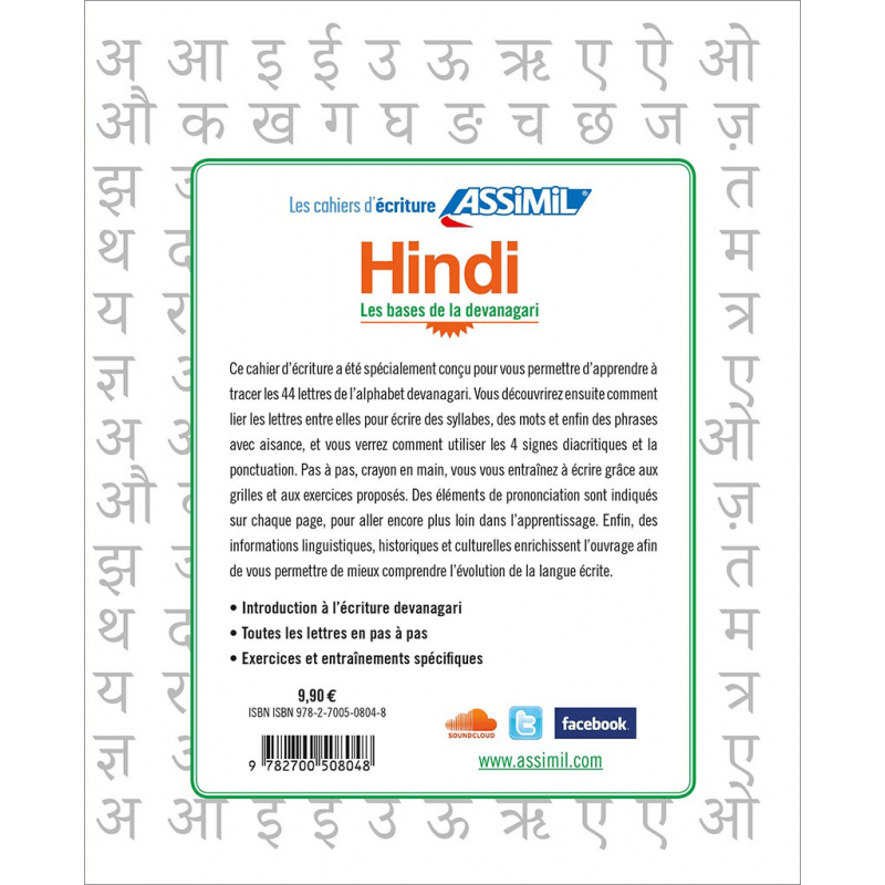 Ce cahier d’écriture a été spécialement conçu pour vous permettre d’apprendre à tracer les 44 lettres de l’alphabet devanagari en caractères d’imprimerie et manuscrits. Vous découvrirez ensuite comment lier les lettres entre elles pour écrire des syllabes, des mots et enfin des phrases avec aisance. Pas à pas, crayon en main, vous vous entraînez à écrire grâce aux grilles et aux exercices corrigés proposés ici. Des éléments de prononciation sont indiqués sur chaque page, pour aller encore plus loin dans l’apprentissage. Enfin, des informations linguistiques, historiques et culturelles enrichissent l’ouvrage afin de vous permettre de mieux comprendre l’évolution de la langue écrite.