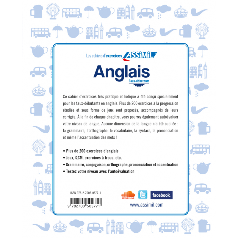 Ce cahier d’exercices très pratique et ludique a été conçu spécialement pour les faux-débutants en anglais. Plus de 200 exercices à la progression étudiée et sous forme de jeux sont proposés, accompagnés de leurs corrigés. À la fin de chaque chapitre, vous pourrez également autoévaluer votre niveau de langue. Aucune dimension de la langue n’a été oubliée : la grammaire, l’orthographe, la syntaxe, la prononciation et même l’accentuation des mots !