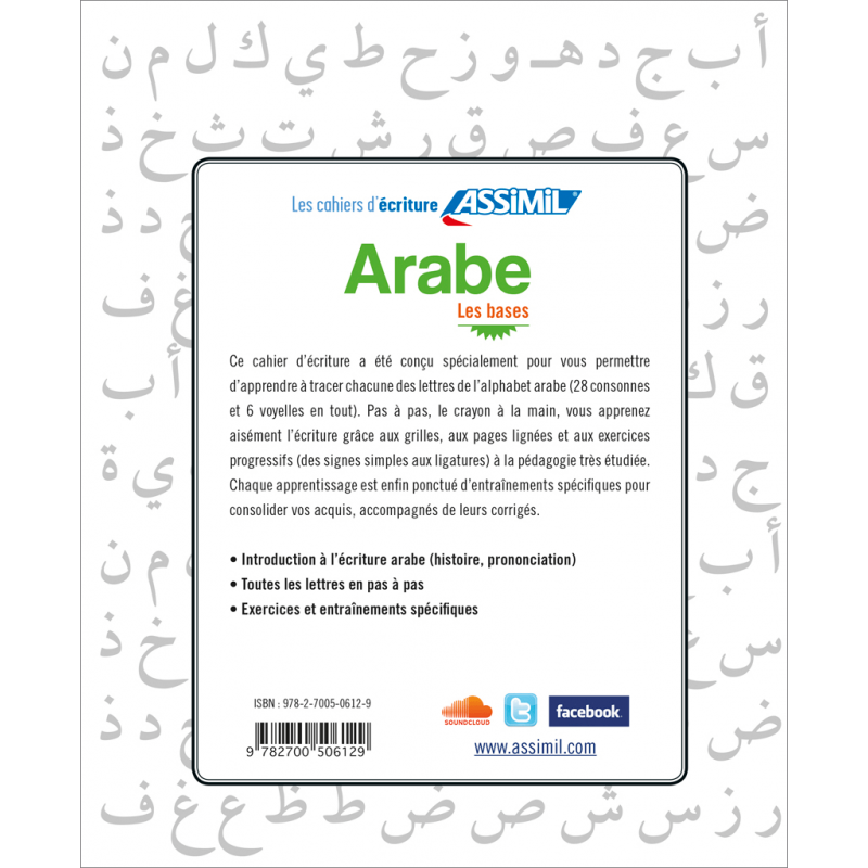 Ce cahier d’écriture a été spécialement conçu pour vous permettre d’apprendre à tracer chacune des lettres de l’alphabet arabe (28 consonnes et 6 voyelles en tout). Pas à pas, le crayon à la main, vous apprenez aisément l’écriture grâce aux grilles, aux pages lignées et aux exercices progressifs (des signes simples aux ligatures) à la pédagogie très étudiée. Chaque apprentissage est enfin ponctué d’entraînements spécifiques pour consolider vos acquis, accompagnés de leurs corrigés.
