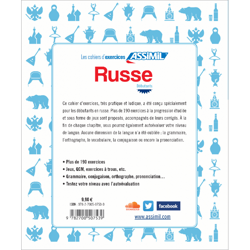 Ce cahier d’exercices, très pratique et ludique, a été conçu spécialement pour les débutants en russe. Plus de 190 exercices à la progression étudiée et sous forme de jeux sont proposés, accompagnés de leurs corrigés. À la fin de chaque chapitre, vous pourrez également autoévaluer votre niveau de langue. Aucune dimension de la langue n’a été oubliée : la grammaire, l’orthographe, le vocabulaire, la conjugaison ou encore la prononciation.