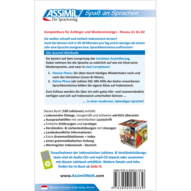 Parlé par plus de 200 millions de locuteurs, l’indonésien est la langue qui cimente le plus grand archipel du monde et à connaître pour visiter Bali et Java autrement. L’indonésien est d’une extrême simplicité car les conjugaisons, marques de genre ou de pluriel n’existent pas ! L’importance du contexte, l’agencement de la phrase et les affixes constituent la différence essentielle avec les langues occidentales. Par une étude régulière pendant 6 à 8 mois, cette méthode vous offre la possibilité d’atteindre la pratique courante de la conversation de tous les jours.