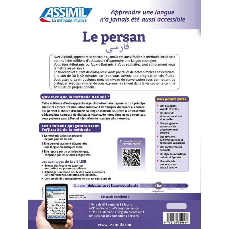Langue indo-européenne, le persan utilise l’alphabet arabe et est parlé par 100 millions de personnes, principalement en Iran et en Afghanistan. Cette méthode, très progressive, vous guide pas à pas de l’écriture à la langue parlée, riche en expressions poétiques et imagées. Les 86 leçons du livre sont également enrichies de notes culturelles, reflets de légendes et de traditions millénaires.