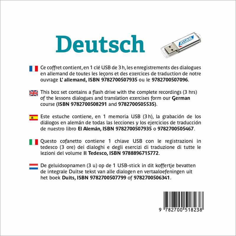 Ce coffret comprend les enregistrements correspondant aux livres L’allemand (ISBN 9782700507096 et 9782700502879), Il Tedesco (ISBN 9788896715772), El alemán (ISBN 9782700505467), German (ISBN 9782700505535 ou 9782700508291) et Duits (ISBN 9782700507799).