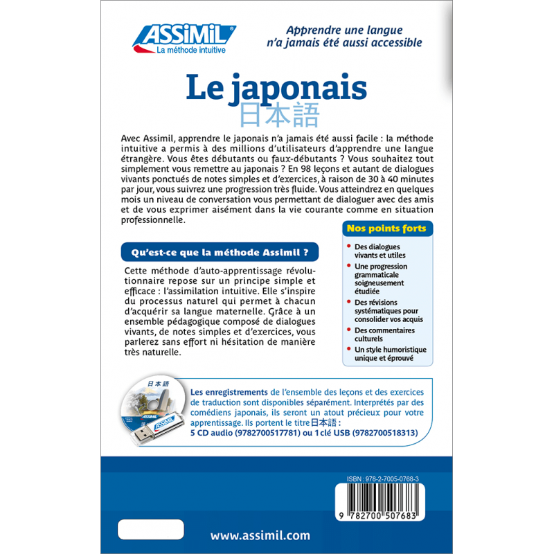 Le japonais est la deuxième langue la plus traduite dans l’espace francophone après l’anglais. Voici une nouvelle édition, entièrement mise à jour et désormais en un seul volume, de ce classique de la collection Sans Peine. Permettant un véritable démarrage de l’apprentissage du japonais, la méthode Assimil a fait ses preuves même pour cette langue réputée difficile. Au fil des 98 leçons, vous acquerrez petit à petit les bases de la langue parlée et les "clés" de son écriture. Le but à atteindre étant la maîtrise de 900 idéogrammes qui vous permettront de tenir une conversation de la vie de tous les jours.