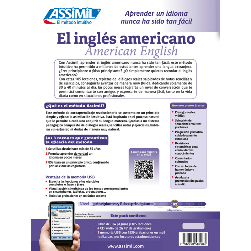 Si l'anglais britannique et l'anglais américain présentent des similitudes, ces deux langues sœurs offrent bien des différences, notamment au niveau de la prononciation et du lexique. Si vous projetez un séjour aux États-Unis ou si vous devez travailler en américain, l'anglais britannique ne sera pas suffisant. En nous suivant attentivement – et régulièrement – vous apprendrez en quelques mois le vocabulaire de la langue courante, ainsi que les règles fondamentales de la grammaire. Très rapidement, l'anglais d'Amérique vous semblera familier, grâce à une centaine de dialogues tirés de la vie quotidienne que nous vous présentons dans ce coffret, sur CD audio et clé USB.
