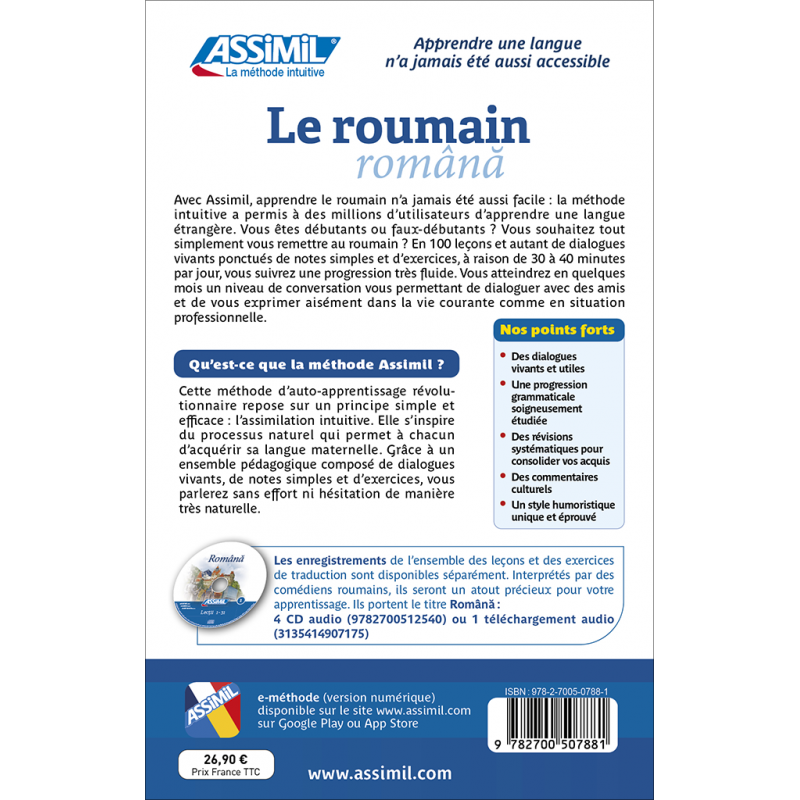 Les enregistrements de l’ensemble des leçons et des exercices de traduction sont disponibles séparément. Interprétés par des locuteurs natifs professionnels, ils seront un atout précieux pour votre apprentissage. Ils portent le titre : Română - 4 CD audio (9782700512540), 1 CD mp3 (9782700517934), 1 clé USB (9782700518511) ou 1 téléchargement mp3 (3135414907175).