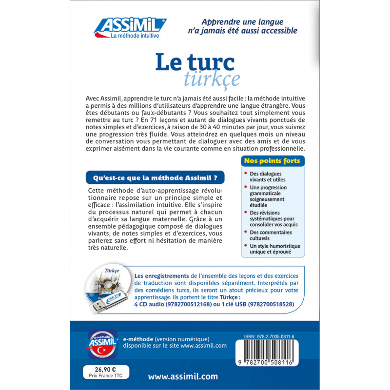 La structure particulière de la langue turque vous est dévoilée progressivement par les auteurs, qui ont su allier son processus d’acquisition à son contexte historique et traditionnel, ainsi qu’à son intérêt culturel. C’est, bien entendu, un turc actuel et vivant qui vous est proposé dans cet ouvrage.