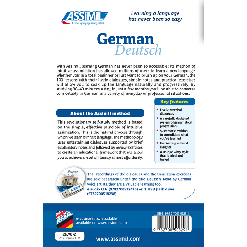 Les enregistrements de l’ensemble des leçons et des exercices de traduction sont disponibles séparément. Interprétés par des comédiens allemands, ils seront un atout précieux pour votre apprentissage. Ils portent le titre : Deutsch - 4 CD audio (9782700512410), 1 CD mp3 (9782700517866), 1 clé USB (9782700518238) ou 1 téléchargement mp3 (3135414906772).