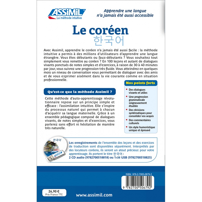 Les enregistrements de l’ensemble des leçons et des exercices de traduction sont disponibles séparément. Interprétés par des comédiens coréens, ils seront un atout précieux pour votre apprentissage. Ils portent le titre : 한국어 - 2 CD audio (9782700518818), 1 clé USB (9782700518825) ou 1 téléchargement mp3 (3135414906864).