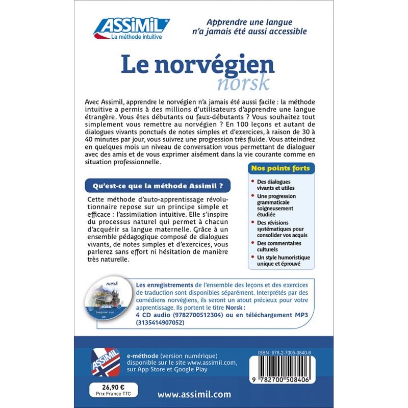 Le norvégien est parlé par environ quatre millions de personnes. Il ne s’agit donc pas d’une langue majeure... mais à coup sûr d’une langue passionnante. Cette méthode vous propose un apprentissage complet du langage quotidien, que vous atteindrez en 6 mois d’étude.