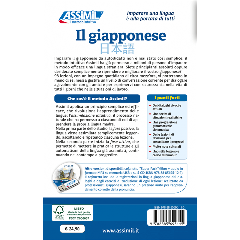 Voici une nouvelle édition mise à jour de ce classique de la collection "Senza Sforzo", pour apprenant italien. Permettant un véritable démarrage de l’apprentissage du japonais, la méthode Assimil a fait ses preuves même pour cette langue réputée difficile. Au fil des 98 leçons, vous allez acquérir petit à petit les bases de la langue parlée et les "clés" de son écriture. Le but à atteindre est la maitrise de 900 idéogrammes qui permet de tenir une conversation de la vie de tous les jours.