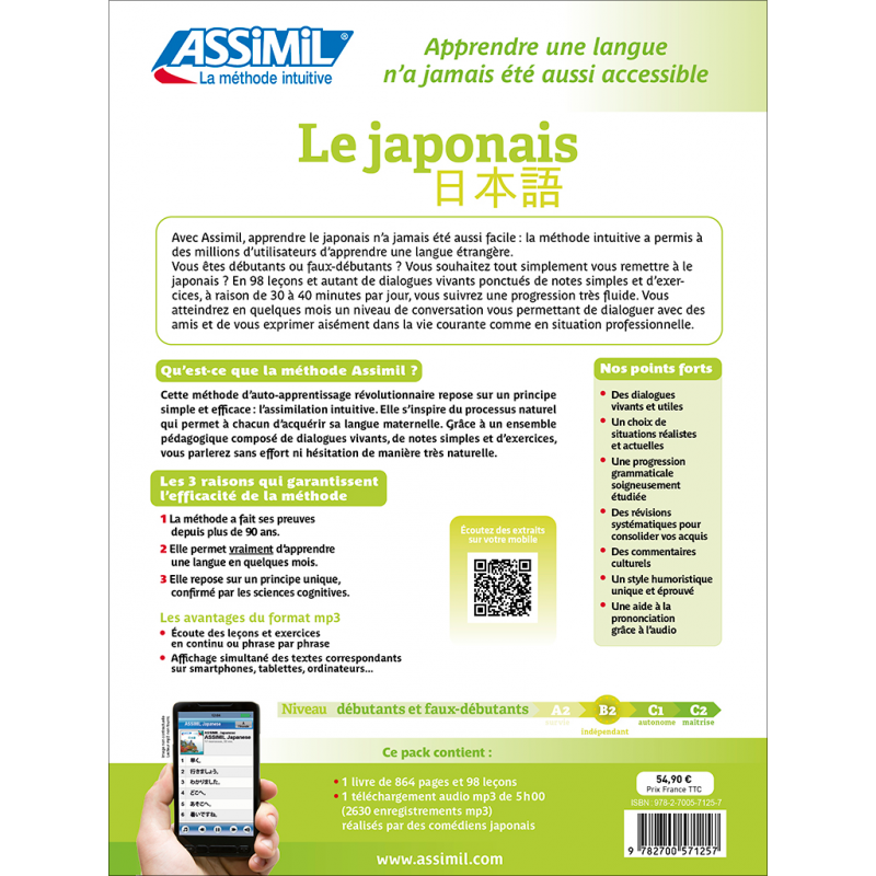 Envie d'apprendre le japonais ou de vous y remettre ? En nous suivant attentivement – et régulièrement –, vous allez apprendre en quelques mois le vocabulaire de la langue courante, ainsi que les règles fondamentales de la grammaire. Très rapidement, cette belle langue vous semblera familière, grâce à la centaine de dialogues tirés de la vie quotidienne que nous vous présentons, dans ce coffret, en téléchargement.