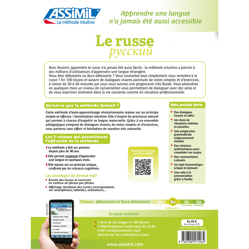Envie d'apprendre le russe ou de vous y remettre ? En nous suivant attentivement – et régulièrement –, vous allez apprendre en quelques mois le vocabulaire de la langue courante, ainsi que les règles fondamentales de la grammaire. Très rapidement, cette belle langue vous semblera familière, grâce à la centaine de dialogues tirés de la vie quotidienne que nous vous présentons, dans ce coffret, en téléchargement.