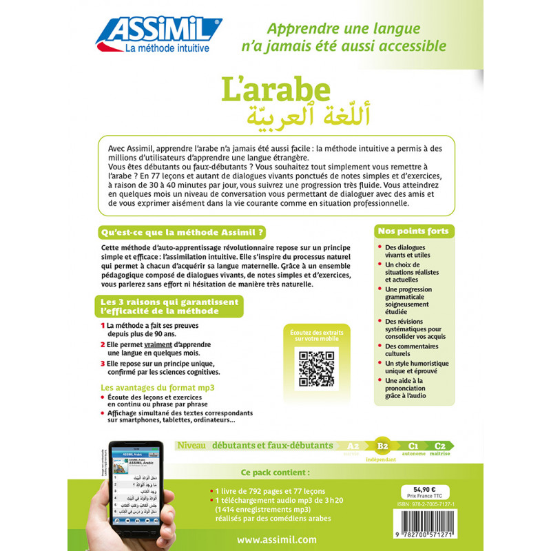 Envie d'apprendre l'arabe ou de vous y remettre ? En nous suivant attentivement – et régulièrement –, vous allez apprendre en quelques mois le vocabulaire de la langue courante, ainsi que les règles fondamentales de la grammaire. Très rapidement, cette belle langue vous semblera familière, grâce à la centaine de dialogues tirés de la vie quotidienne que nous vous présentons, dans ce coffret, en téléchargement.