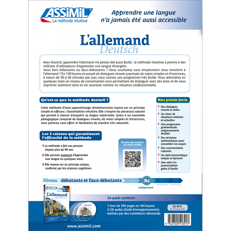 Les enregistrements reprennent l’intégralité des textes en allemand des leçons et des exercices de traduction du livre. Ils sont interprétés, à un rythme progressif, par des locuteurs natifs professionnels.