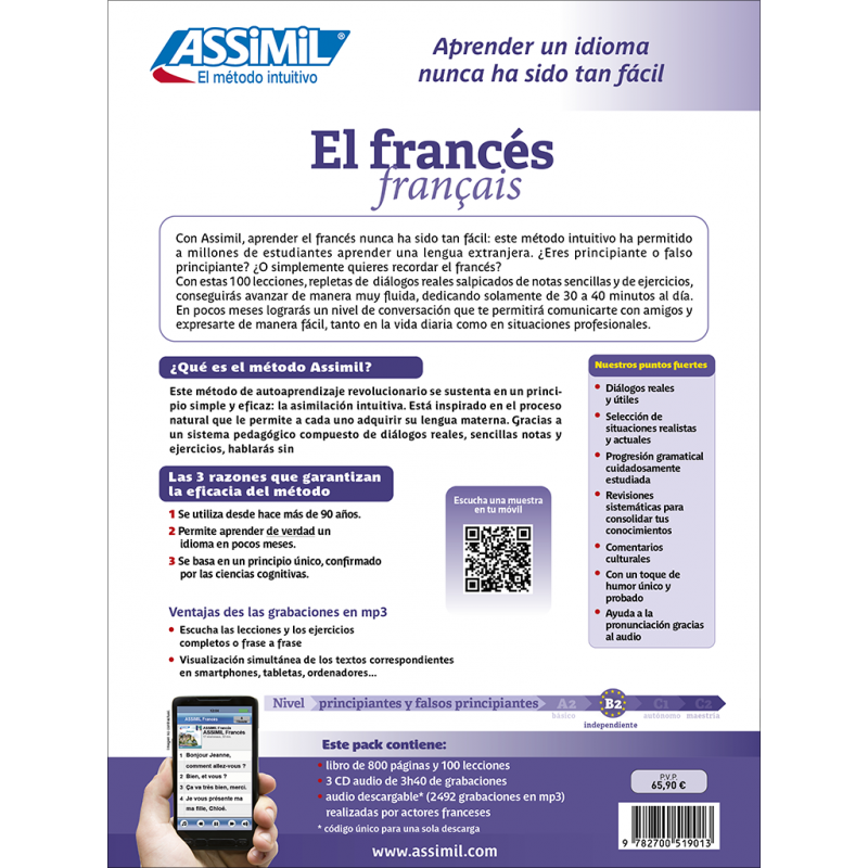 Une méthode avec laquelle rien n’est à apprendre par coeur, idéale pour débuter ou réviser. L’apprenant commence à savoir parler français au bout de deux mois et la grammaire est assimilée intuitivement. Le niveau atteint après six mois est celui de la conversation courante avec la maîtrise de 1500 à 2000 mots de vocabulaire.