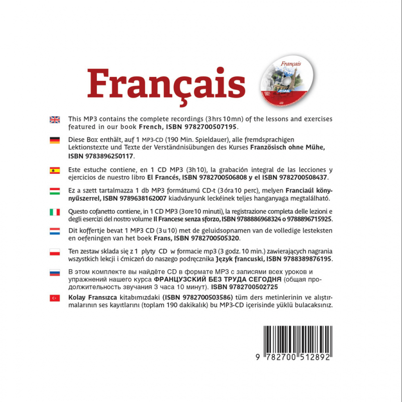 Ce coffret comprend les enregistrements correspondant aux livres French (ISBN 9782700507195), Französisch ohne Mühe (ISBN 9783896250117), El francés (ISBN 9782700506808 ou 9782700508437), Il francese (ISBN 9788869715925), Frans (ISBN 9782700507805 ou 9782700505320) et Французский (français pour Russes) (ISBN 9782700507973).
