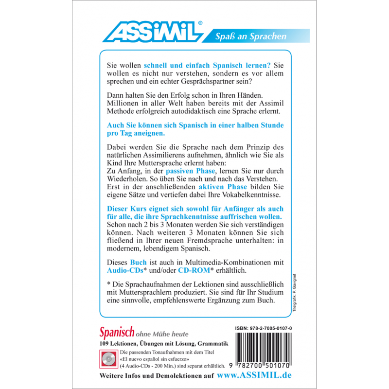 Les enregistrements de l’ensemble des leçons et des exercices de traduction sont disponibles séparément. Interprétés par des locuteurs natifs professionnels, ils seront un atout précieux pour votre apprentissage. Ils portent le titre : El nuevo español sin esfuerzo - 1 CD mp3 (9782700513035), 4 CD audio (9782700512021)