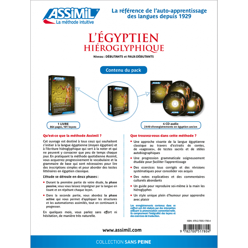 Une méthode d’égyptien hiéroglyphique destinée aux autodidactes manquait aux passionnés de l’Égypte ancienne ! Cette langue a connu plusieurs stades d’évolution au cours de ses trois millénaires d’histoire, et c’est le "moyen égyptien" qui est traité ici, c’est-à-dire la langue de la littérature classique (environ de 2200 à 1500 av. J.-C.) et d’un grand nombre d’inscriptions monumentales.
