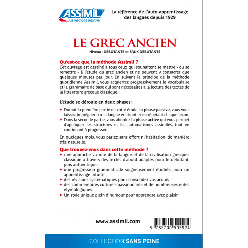 Vous souhaitez remonter aux sources de notre civilisation ? Connaître l’étymologie de presque tout notre vocabulaire savant, mais aussi courant (souvent passé par le tamis du latin, entre-temps) ? Ou tout simplement vous plonger dans la langue de Platon ? En une centaine de leçons, ce manuel vous propose un contact direct avec le grec de l’âge classique et vous transporte dans une Grèce antique bien vivante, originale et formatrice de ce que nous sommes devenus.