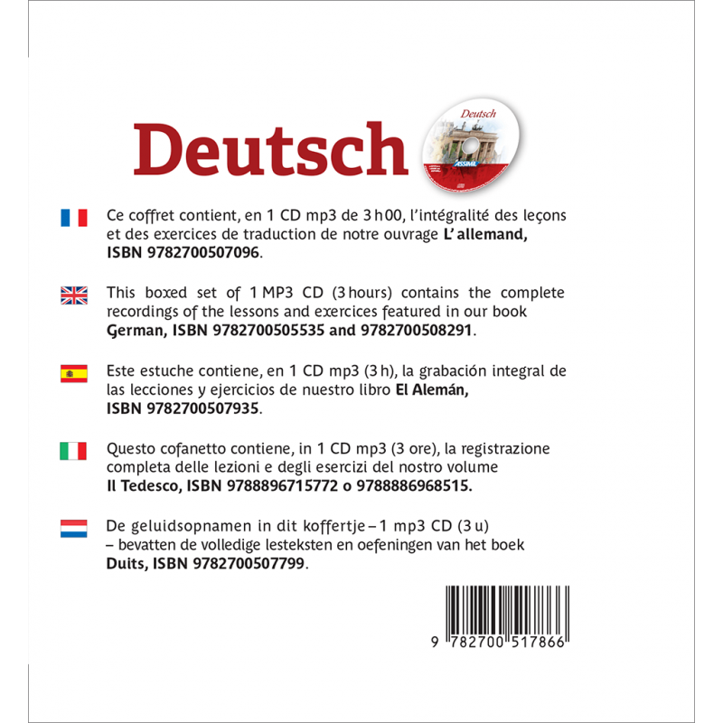 Ce coffret comprend les enregistrements correspondant aux livres L’allemand (ISBN 9782700507096 et 9782700502879), Il Tedesco (ISBN 9788896715772), El alemán (ISBN 9782700505467), German (ISBN 9782700505535 ou 9782700508291) et Duits (ISBN 9782700507799).