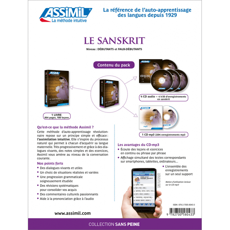 Cet ouvrage est destiné à tous ceux qui souhaitent se mettre – ou se remettre – à l’étude du sanskrit et ne peuvent y consacrer que quelques minutes par jour. En suivant le principe de la méthode quotidienne Assimil, vous acquerrez progressivement le vocabulaire et la grammaire de base qui sont nécessaires à la lecture des textes de la littérature sanskrite classique. Vous trouverez dans cette méthode une approche vivante de la langue et de la culture sanskrites classiques, d'abord à travers des textes adaptés pour le débutant, puis authentiques. En quelques mois, vous manierez la langue sans efforts ni hésitation, de manière très naturelle.