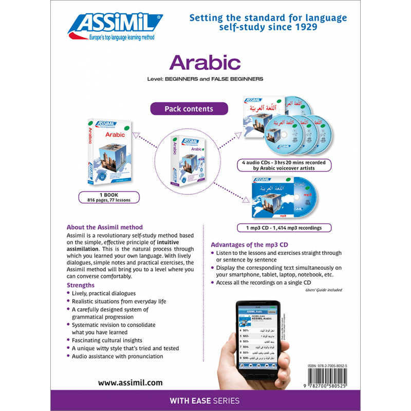 L’arabe est la langue officielle de 22 pays, soit environ 300 millions de locuteurs dans le monde. L’arabe comprend de nombreux dialectes, mais il existe un arabe moderne qui est un instrument d’unification de la langue. C’est l’arabe des média qui est présenté dans cette méthode, langue commune, très proche de l’arabe classique ou littéral, appelé "arabe moderne unifié". Vous apprenez à maîtriser sans grand effort la lecture et à assimiler nombre de constructions simples et de phrases de la vie courante tout en vous initiant à l’écriture, de manière très progressive. Vos acquis vous donnent peu à peu le moyen de vous exprimer et de vous faire comprendre dans un environnement arabophone. Les conseils qui accompagnent les leçons vous guident pas à pas sur le chemin de l’autonomie, et au bout de cette étude, vous pouvez comprendre la presse et la radio et vous exprimer dans toutes les situations de la vie quotidienne.