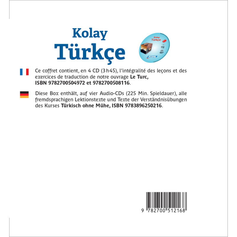 Ce coffret comprend les enregistrements correspondant au livre Le turc (ISBN 9782700508116, 9782700501667 ou 9782700504972) et Türkisch ohne Mühe (ISBN 9783896250216).