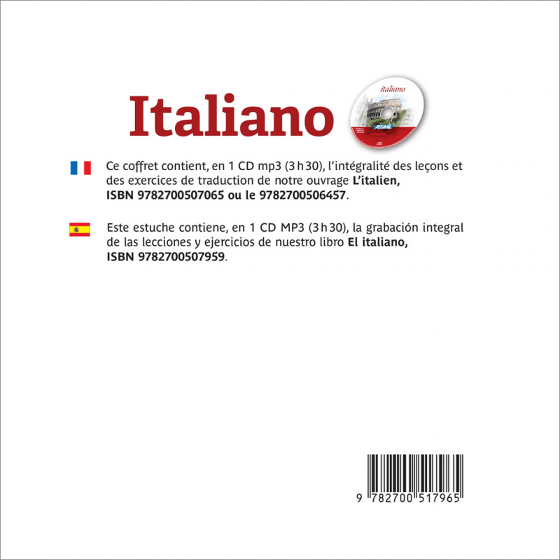 Ce coffret comprend les enregistrements audio correspondant aux livres L'italien (ISBN 9782700507065) et El italiano (ISBN 9782700507959).