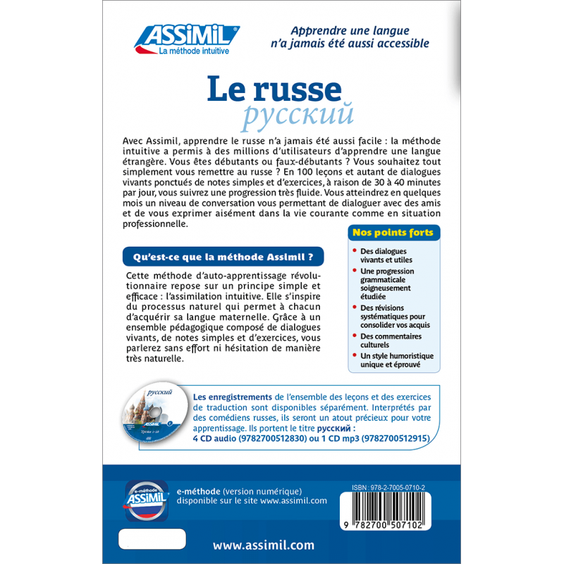 Les enregistrements de l’ensemble des leçons et des exercices de traduction sont disponibles séparément. Interprétés par des comédiens russes, ils seront un atout précieux pour votre apprentissage. Ils portent le titre : Русский - 4 CD audio (9782700512830), 1 CD mp3 (9782700512915), 1 clé USB (9782700518306) ou 1 téléchargement mp3 (3135414907182).