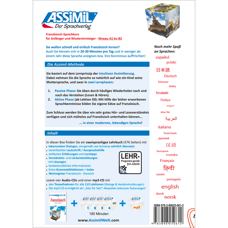 Un livre de 113 leçons en 576 pages, 4 CD audio et 1 CD mp3 (2078 fichiers) d’une durée de 3 h 10