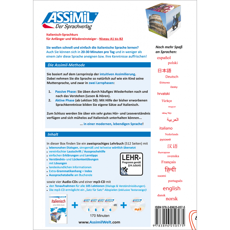 Un livre de 105 leçons en 512 pages, 4 CD audio et 1 CD mp3 (2144 fichiers) d’une durée de 2 h 50