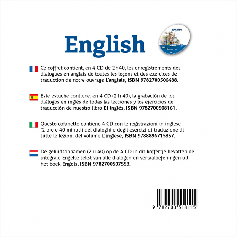 Ce coffret comprend les enregistrements correspondant aux livres L’anglais (ISBN 9782700506488), Engels (ISBN 9782700507553), L'inglese (ISBN 9788896715857) et El inglés (ISBN 9782700508161).