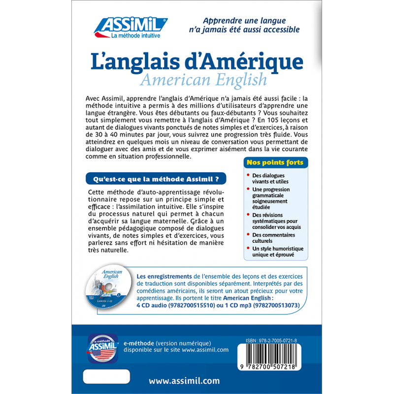 Si l'anglais britannique et l'anglais américain présentent des similitudes, ces deux langues sœurs offrent bien des différences, notamment au niveau de la prononciation et du lexique. Si vous projetez un séjour aux États-Unis ou si vous devez travailler en américain, l'anglais britannique ne sera pas suffisant. En nous suivant attentivement – et régulièrement – vous apprendrez en quelques mois le vocabulaire de la langue courante, ainsi que les règles fondamentales de la grammaire. Très rapidement, l'anglais d'Amérique vous semblera familier, grâce à une centaine de dialogues tirés de la vie quotidienne que nous vous présentons dans cet ouvrage.